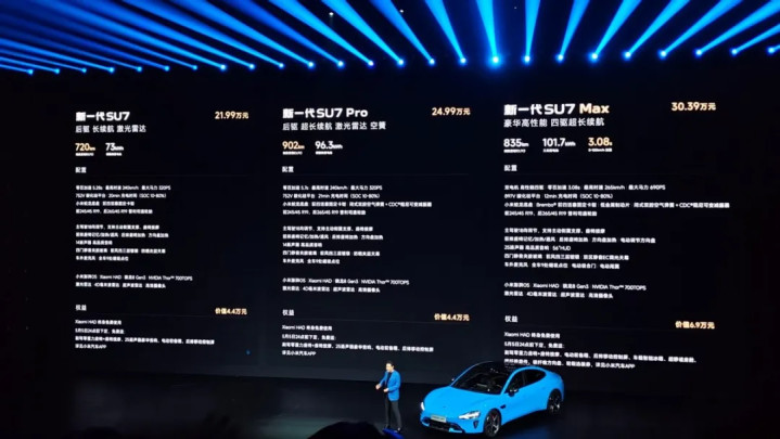 新一代SU7法度版、Pro版和MAX版最终订价辞别为21.99万元、24.99万元和30.39万元。