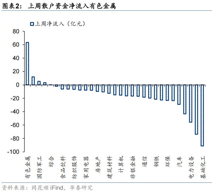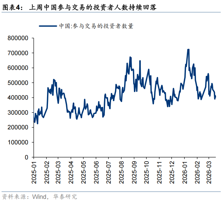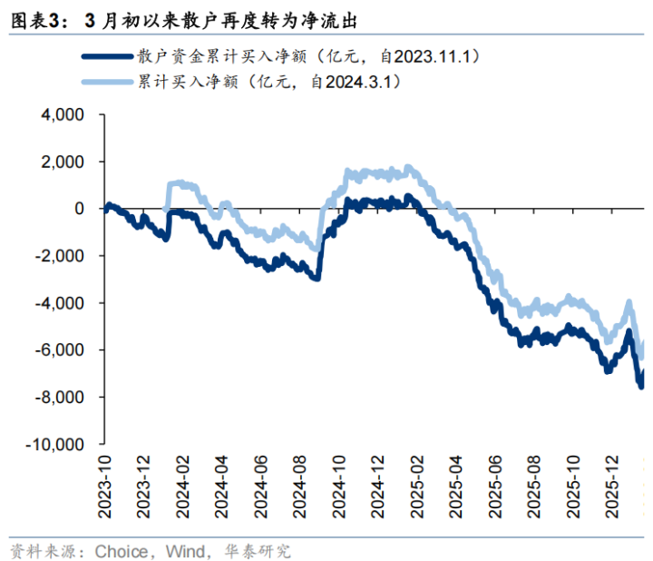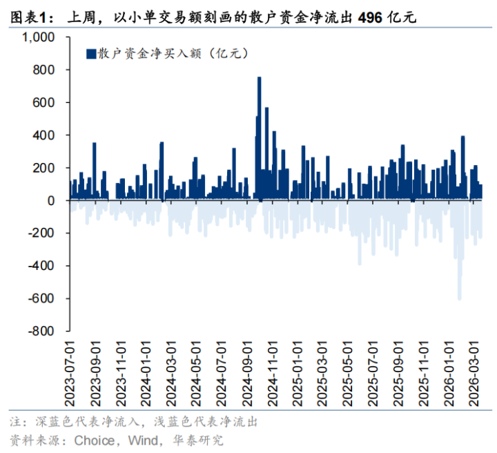 散户资金上周净流出496亿元。(1)数量角度,2月新增开户数252万户,银河国际(GALAXY)环比2026年1月有所回落;(2)流量角度,2026年3月初以来,散户资金再度转为净流出;(3)标的角度,上周散户资金净流入有色金属行业,净流出基础化工、机械勾引、电力勾引等标的。