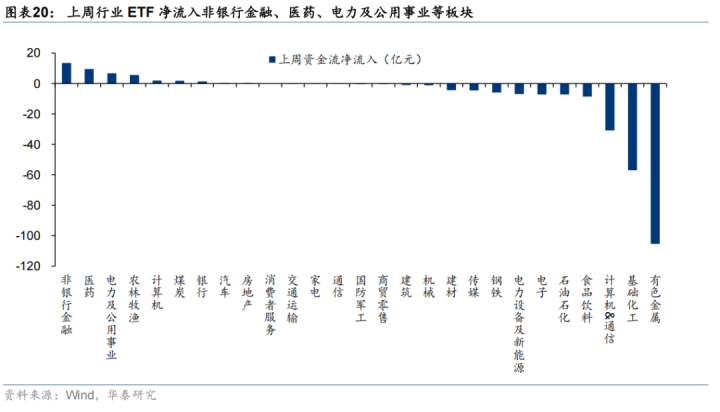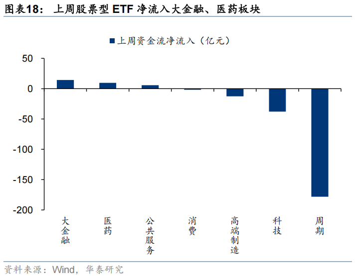 上周股票型ETF净赎回121亿份,净流出95亿元,其中宽基ETF净流入95亿元,净流出收窄。分板块来看,大金融、医药板块净流入边界居前,行业中非银行金融、医药、电力及公用功绩等行业净流入居前。