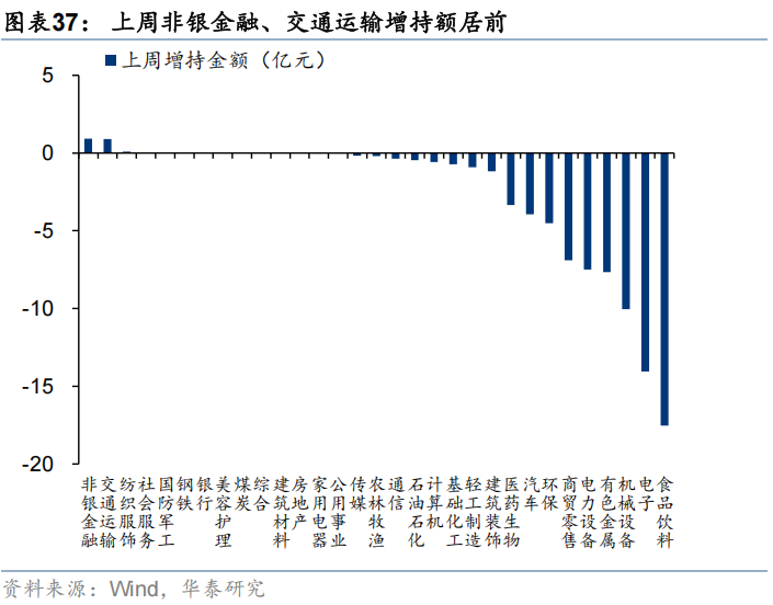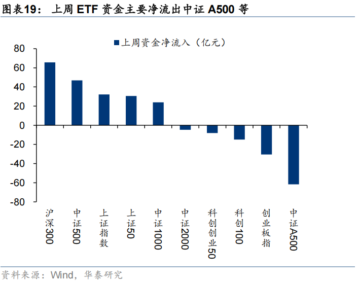 设立型资金中,上周资金设立向堤防侧回荡,1)测算的基金仓位上周震撼回落,其仓位出现向破钞、金融等相对堤防标的腾挪的倾向;2)EPFR统计的设立型外资聚会两期净流出,本期净流出37亿元,净流出有所收窄,其中主动设立型外资净流出6.2亿元,被迫设立型外资净流出30.4亿元。但此外,咱们不雅测到宽基ETF在净流出9周后转向小幅净流入,上周宽基ETF净流入95亿元。