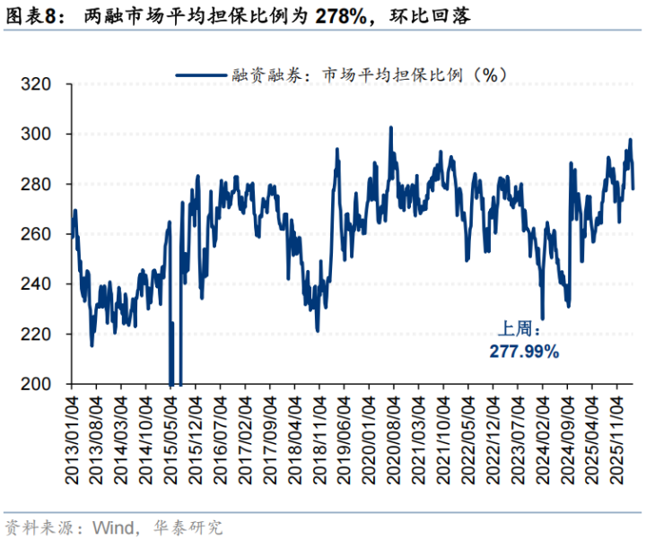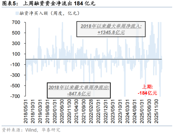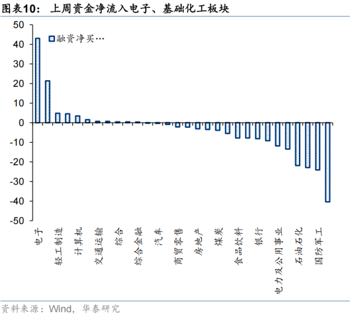 融资资金上周净流出184亿元,融资往返活跃度环比小幅回落。(1)上周融资资金净流出184亿元,(2)融资往返活跃度为9.24%,(3)上周市集平均担保比例为278%,环比小幅下跌,(4)结构上,融资资金净流入电子、基础化工板块,净流出有色金属、国防军工、通讯等板块。