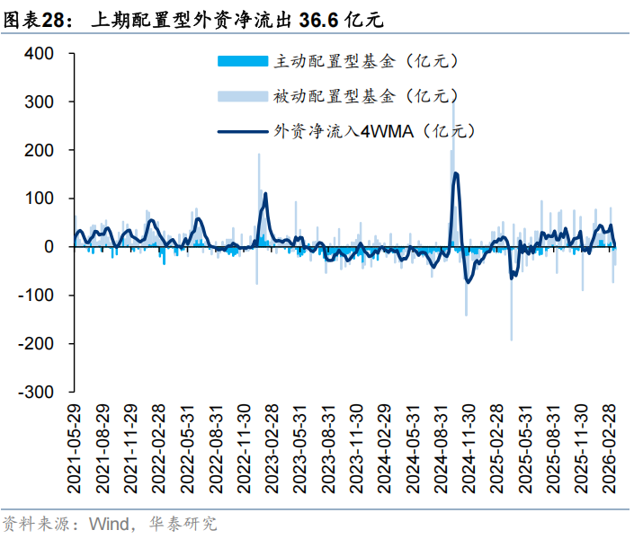 外资:以EPFR统计的设立型外资中,3月11日-3月18日,设立型外资净流出36.6亿元,其中主动设立型外资流出6.2亿元,被迫设立型外资净流出30.4亿元。