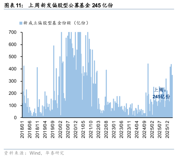 上周新建造偏股型基金245亿份,新发强度环比回落,存量基金中,股票/羼杂基金权柄仓位环比小幅回落。