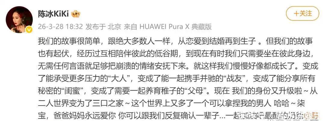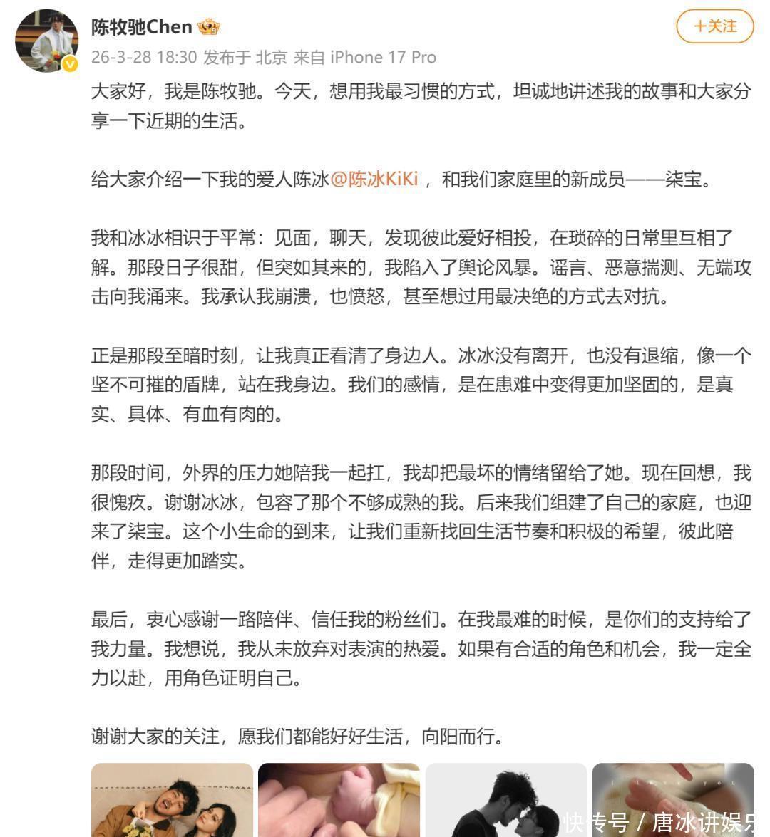 2026年3月28日,演员陈牧驰与歌手陈冰以一场“慢直播”式的官宣,将公众视野再行拉回他们的热沈世界。莫得用心经营的预报片,莫得煽情的音乐渲染,仅凭两篇千字长文与几张生计化相片,这对进出7岁的姐弟恋主角,用三年时间完成了一场从避讳相恋到公开家庭的“非典型叙事”。