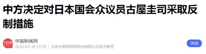 约略是正巧吧,3月30日,中方晓示对日本国会众议员古屋圭司实行反制,依据是反异邦制裁法关联条目。