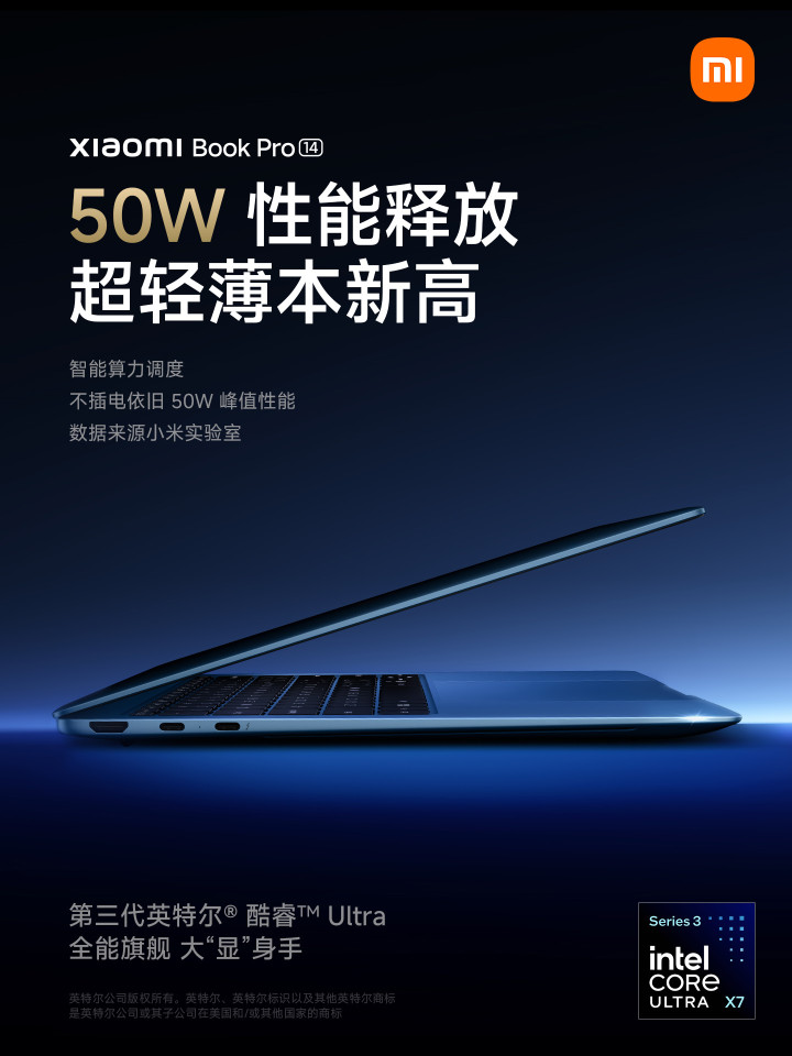 性能方面,小米札记本Pro14至高搭载第三代英特尔酷睿UltraX7358H处置器(PantherLake架构,Intel18A工艺),配备10000mm²VC散热模组,银河国际(GALAXY)禁受双电扇、三风说念散热,握久性能开释可达50W。