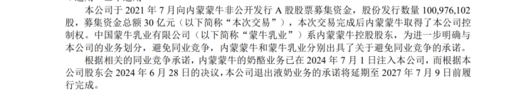 回溯历史,内蒙蒙牛在获取妙可蓝多适度权时曾承诺,将在一按时限内科罚两边在奶酪及液态奶业务上的重合问题。尽管奶酪业务的整合已在2024年通过收购蒙牛奶酪100%股权完成,但液态奶业务的退出却一波又起。2024年6月,公司鼓励大会甘愿将“退出液奶业务”的承诺延期至2027年7月9日,这意味着原定于2024年完成的承诺被推迟了三年。