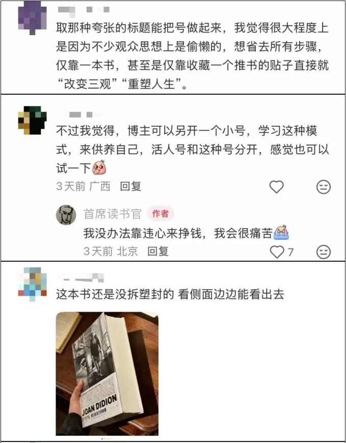 较确凿缘由源于一次“过节”:一天晚上刷手机,他发现存位书友在该博主的荐书条记下留言“中国东说念主不骗中国东说念主,我如故被骗得够多了,这本书顺眼吗?”张弛恩就地回话书友,“你去他主页看一下就知说念了”。再点开条记时,他发现我方被该博主删除驳倒并拉黑。