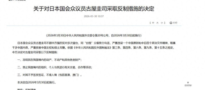 3月30日,我海酬酢部发布了第20号召,其中指出日本众议员古屋圭司不顾中方的横暴反对,同“台独”势力勾通,恶毒干预中国内务,仍是严重违反了一个中国原则和中日四个政事文献的精神。中方将依据计划法律对古屋圭司采取一系列的反制门径,包括不允许其插手包括港澳地区在内的中国疆土,冻结其在中国境内的各样钞票,严禁我国境内的组织和个东说念主同其进行交易、连结等举止。
