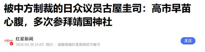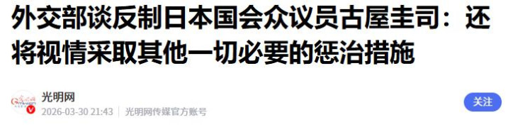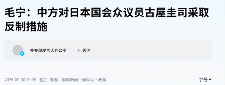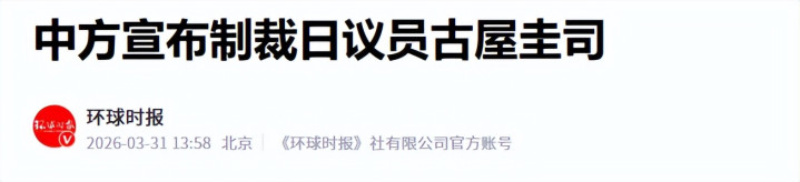 中方一直保合手克制,屡次劝诫日方罢手寻衅,但日本十足欠妥回事,反而变本加厉。疾首蹙额之下,中方终于动手。2026年3月30日,应酬部正经发布公告,依据《反异邦制裁法》,对古屋圭司取舍三项反制要领。